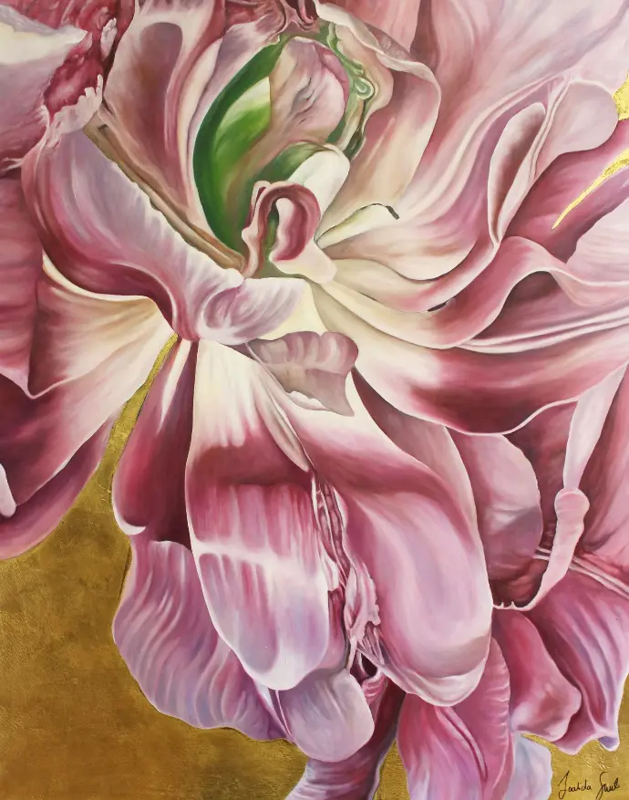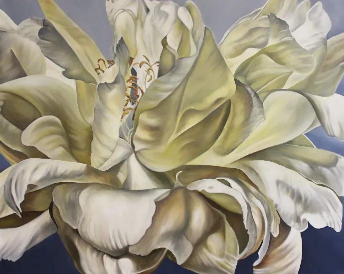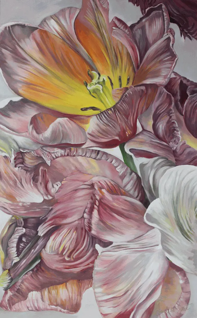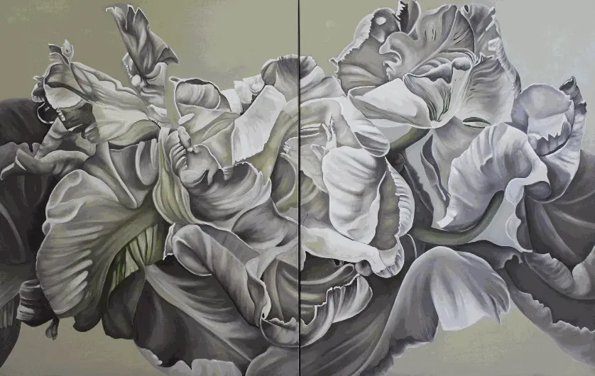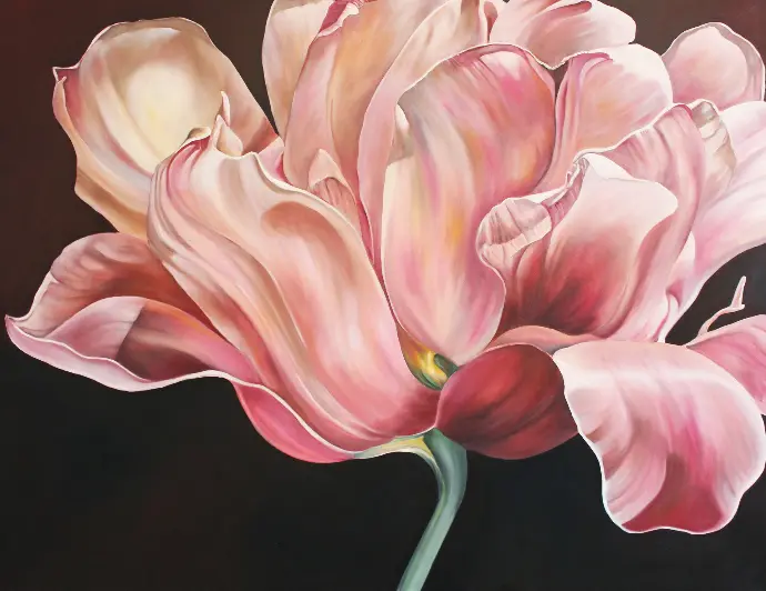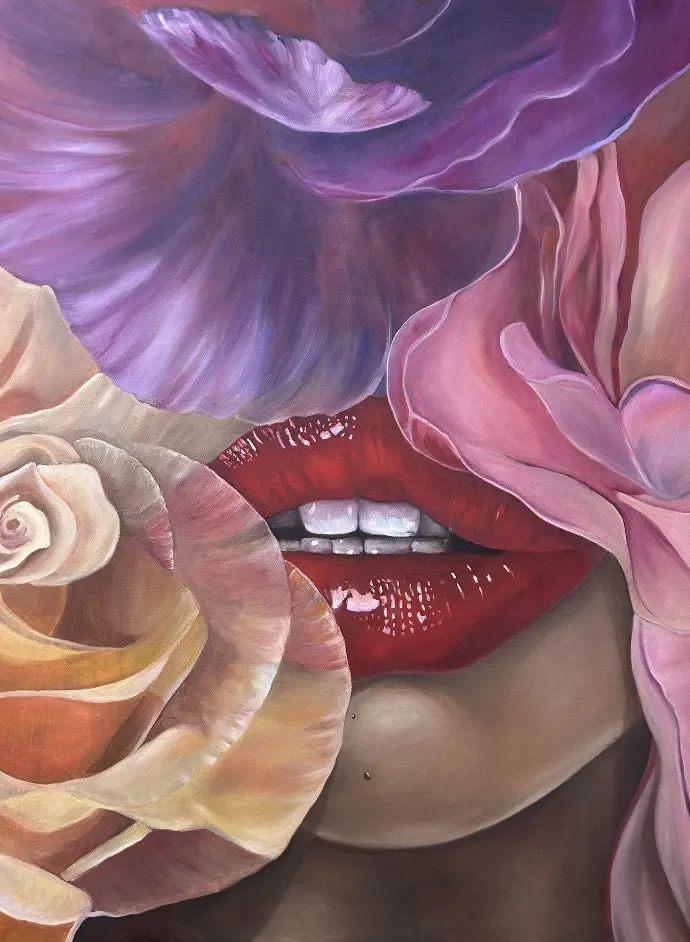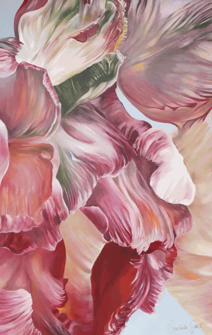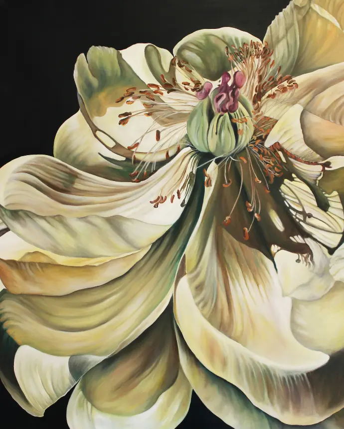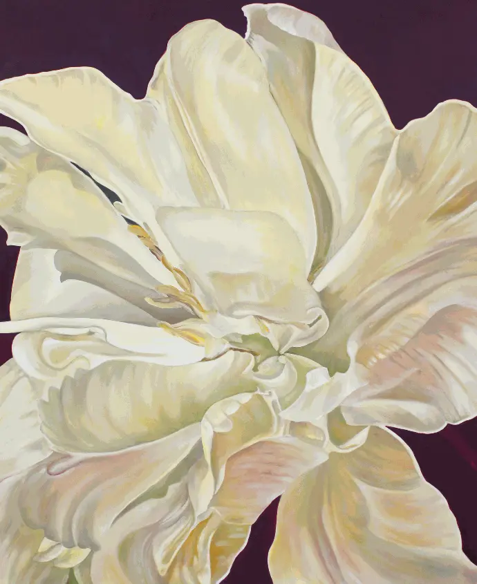 This series explores what lies beyond ambiguity — the paradox of two things being true at once. Using chiaroscuro, the interplay of light and dark, I paint blossoms with oversized, sculpted petals alive with contrast.
