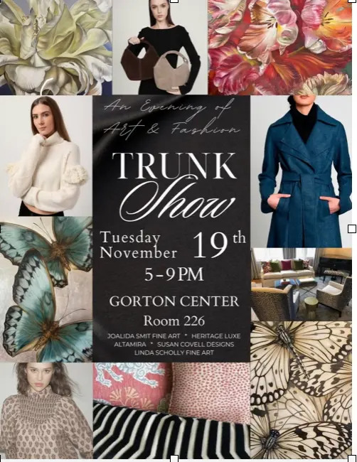 Each year, studio-mate Susan Sands and I open our studio (Studio 13) at the Gorton Center for an exclusive trunk show celebrating contemporary art and fashion. The event brings together local female entrepreneurs in art, fashion, and design, offering guests the opportunity to meet the women behind the brands. It’s an evening of creativity and connection - sharing a glass of bubbly while discovering new collections, inspirations, and end-of-season pieces at accessible prices.